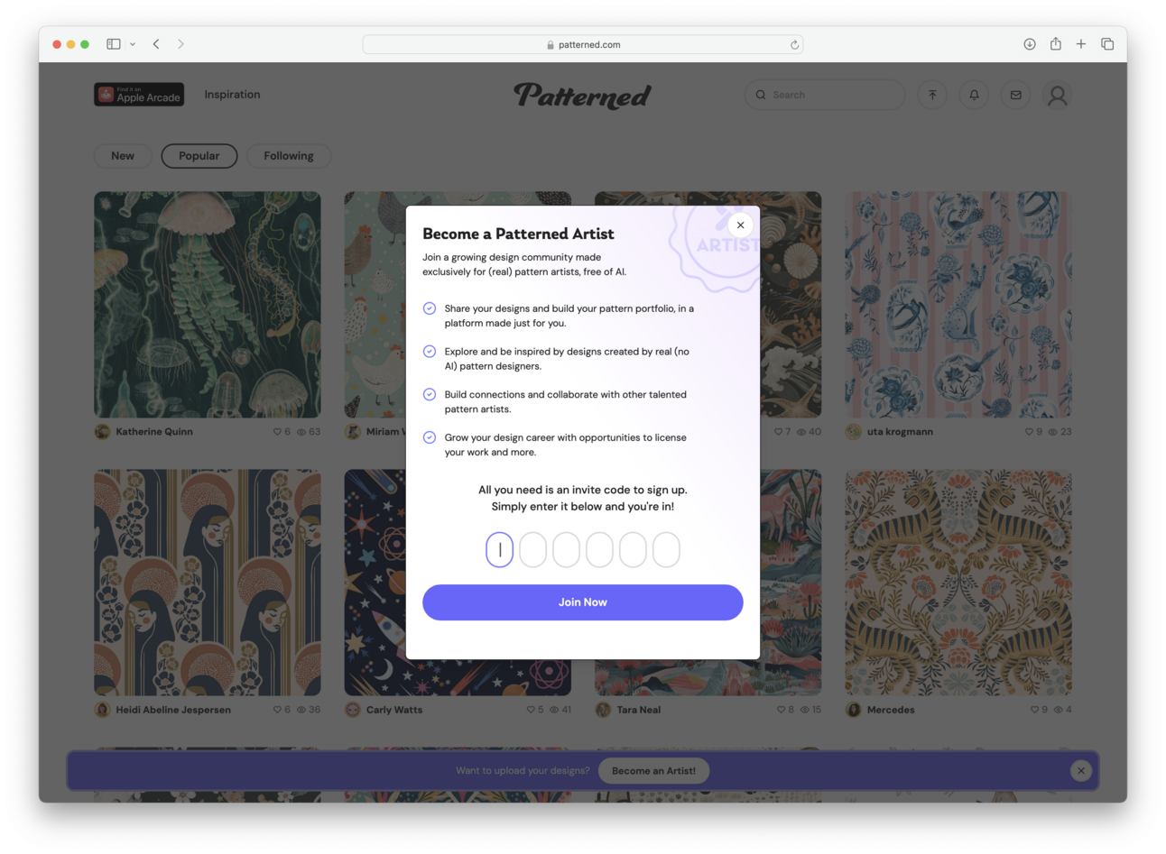 As an alternative, you can always visit https://patterned.com/upgrade after you're logged in to apply your invite code.